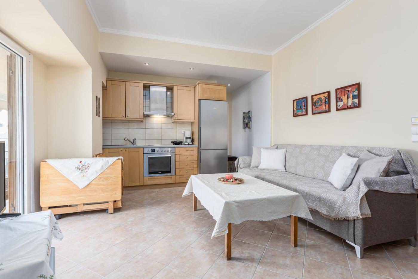 Two-Bedroom Apartment. Boasting a private entrance, this air-conditioned apartment includes 1 living room, 2 separate bedrooms and 1 bathroom with a bath and a shower. In the kitchen, guests will find a stovetop, a refrigerator, kitchenware and an oven. Featuring a terrace with sea views, this apartment also offers a washing machine and a flat-screen TV. The unit has 3 beds.